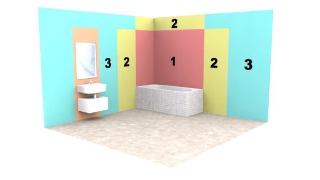 Avšak pri spotrebiči s patričným stupňom ochrany platia isté pravidlá pre bezpečné umiestnenie v kúpeľni. Kúpeľňa je normou rozdelená do niekoľkých zón: