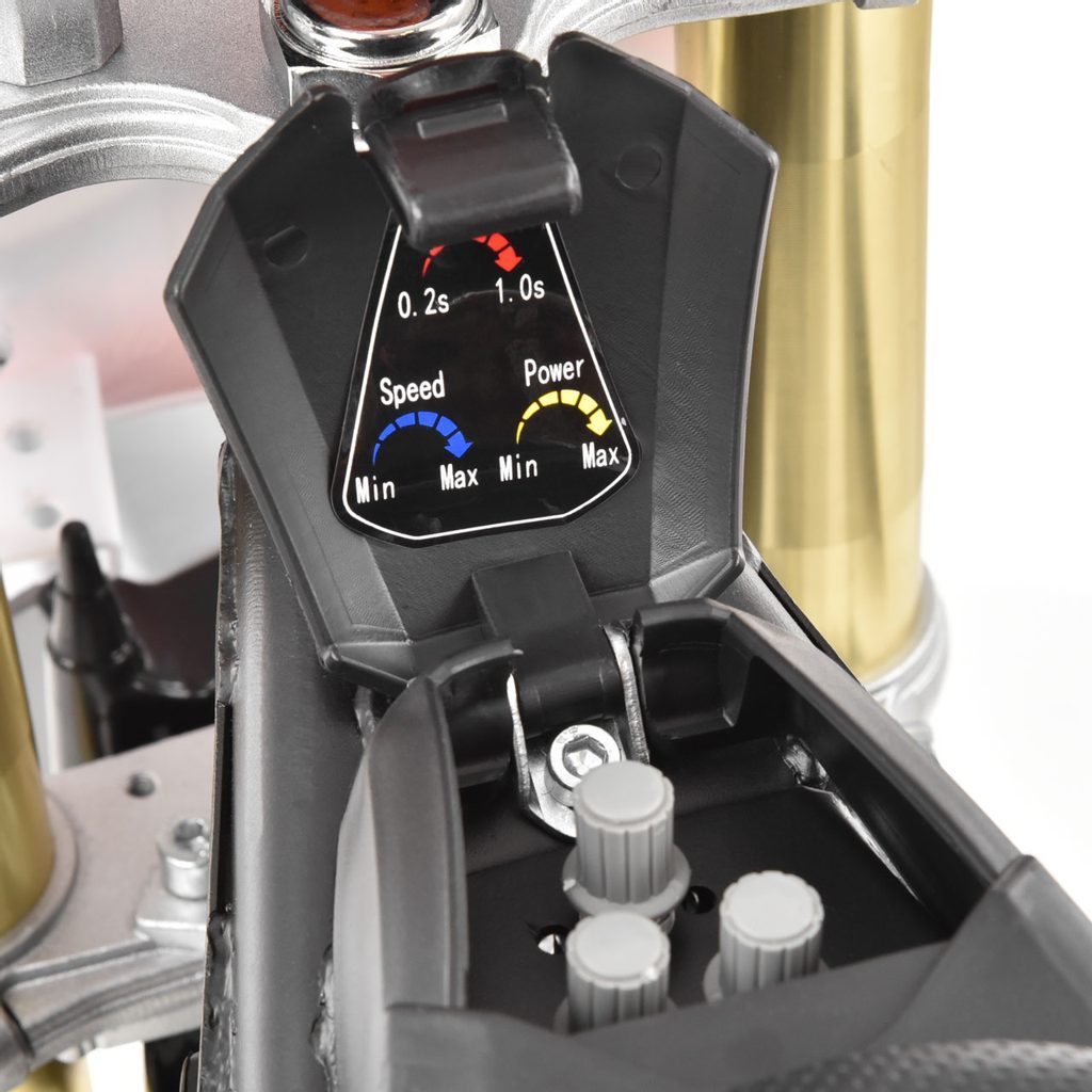 Motorka je vybavená 12" predným a 10" zadným kolesom. Dĺžka je 133 cm, celková výška je 86,5 cm a v najširšom bode (riadidlá) meria 64 cm.