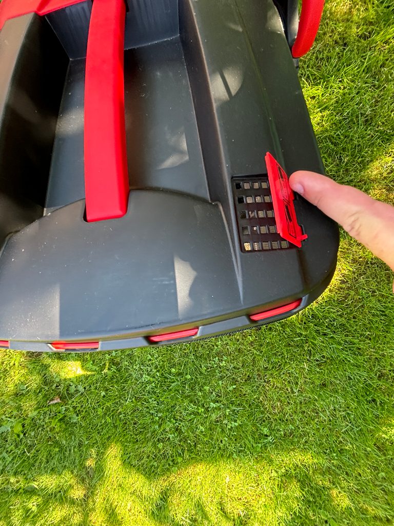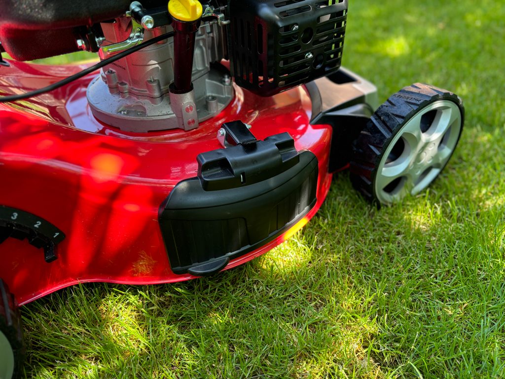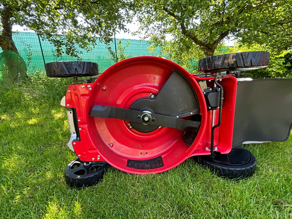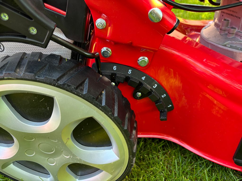 Nastavenie výšky kosenia sa vykonáva centrálne, jedinou pákou pri ľavom zadnom kolese v rozsahu od 25 do 75 mm. Kolesá sú samozrejme osadené na guličkových ložiskách.