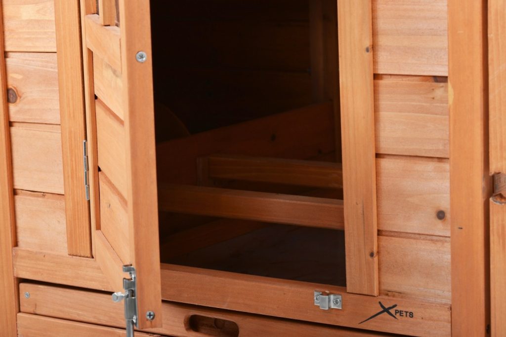 Kurín s výbehom, znášacím boxom a možnosťou uzatvárania na noc. Rozmery 198 x 75 x 102,5 cm. Zhotovený z odolného jedľového dreva. Strecha pokrytá asfaltovými šindľami. Bez spodného pletiva.