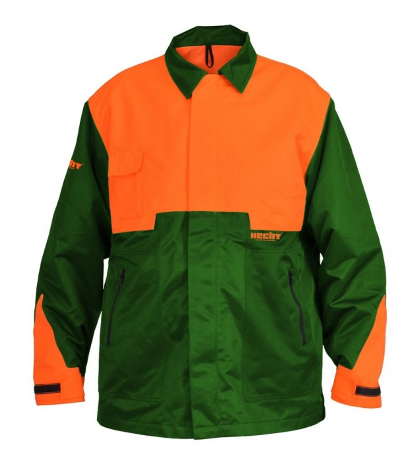 Pracovná bunda pre prácu s motorovou pílou, veľkosť XXL. Zips prekrytý chlopňou so suchým zipsom. Vrecko na mobilný telefón. Dve vrecká na zips. Rukávy sťahovateľné na zápästí. Materiál: 100% polyester oxford.