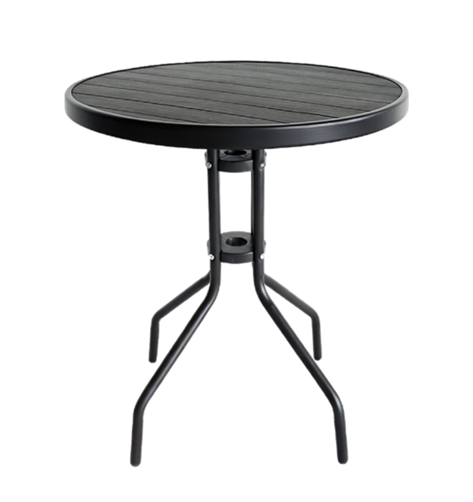 Stôl má okrúhlu dosku s priemerom O 60 cm a výšku 70 cm, čo poskytuje dostatok priestoru pre pohodlné stolovanie alebo odloženie nápojov a drobných predmetov. Konštrukcia stola je tvorená pevnými kovovými nohami, ktoré zaisťujú dobrú stabilitu pri používaní. Doska stola je vyrobená z plastového materiálu s dreveným vzhľadom, vďaka čomu kombinuje prírodnú estetiku s jednoduchou údržbou a dobrou odolnosťou voči poveternostným vplyvom.