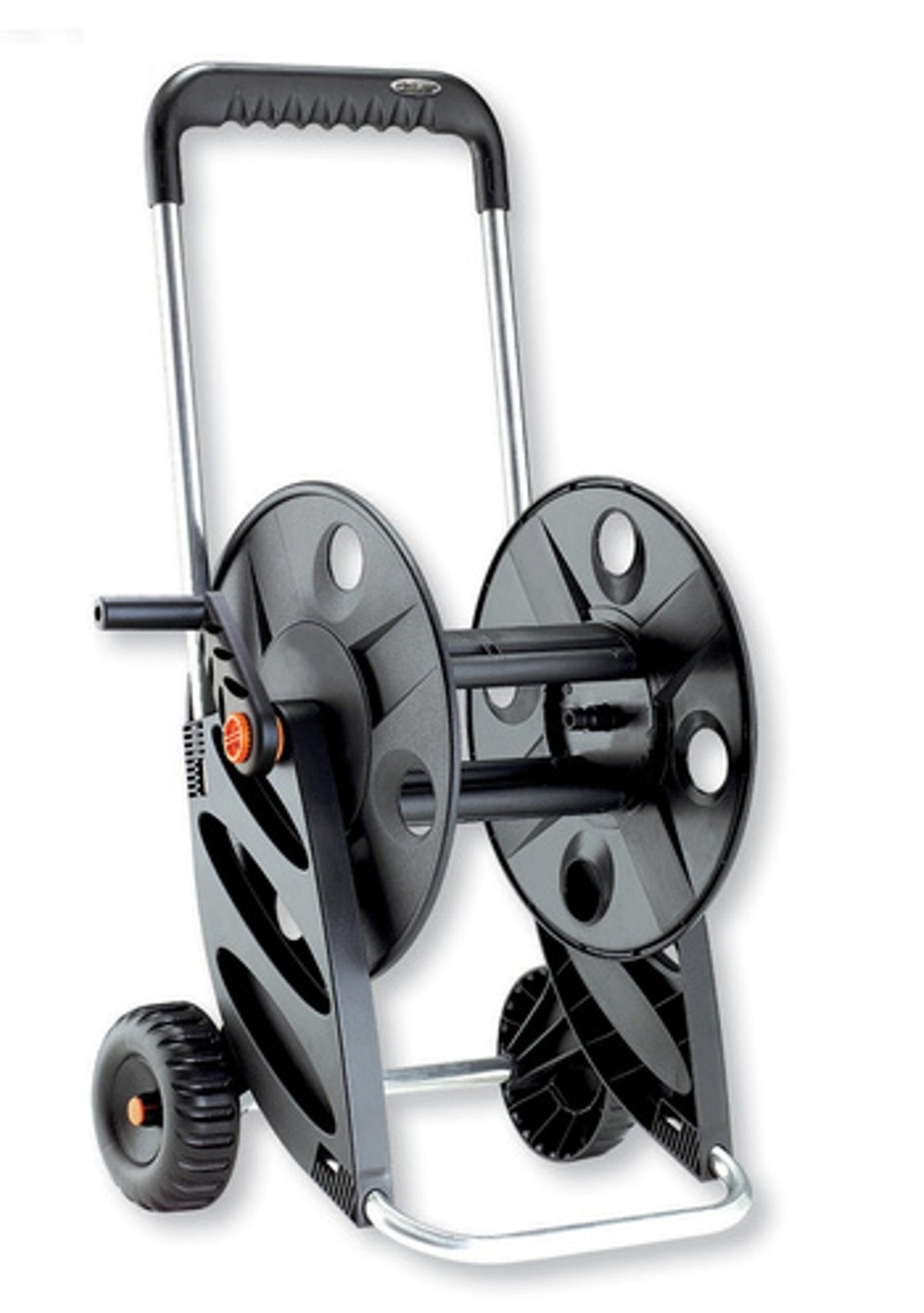 Vozík na záhradnú hadicu Silver - AL s ergonomickou plastovou rukoväťou, jednoduchá montáž bez použitia náradia, robustný, s veľmi nízkou hmotnosťou, vyrobený z plastu a hliníkových rúrok odolných voči korózii, v balení s rýchlospojkou na záhradnú hadicu, kapacita návinu" 1/2" - 60 m, 5/8 - 50 m.