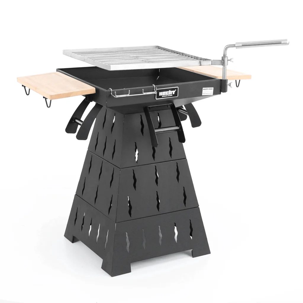 Gril HECHT VESUV 3 in 1 poslúži nielen ako klasický gril, použiť možno aj ako BBQ alebo ohnisko. Dodávaný je na oceľovom podstavci, použiť možno aj samostatne, bez podstavca. Veľkou výhodou je nerezový, výškovo nastaviteľný a zároveň otočný rošt. Vďaka tomu máte dokonalú kontrolu nad grilovaním. Ak by sa napríklad uhlie v ohnisku nečakane silno rozhorelo, jednoducho rošt otočíte mimo ohniska a plamene skrotíte, bez toho aby sa pokrm pripálil. Rovnako jednoducho môžete rošt otočením odsunúť pri dopĺňaní uhlia. Pri práci iste oceníte aj dve drevené odkladacie plochy.