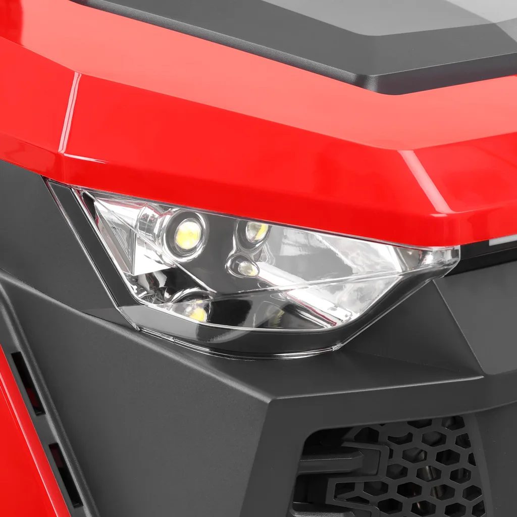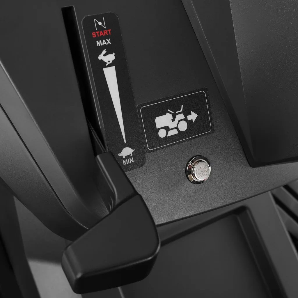 Ovládanie stroja je maximálne pohodlné vďaka hydrostatickej prevodovke, ktorá umožňuje plynulú reguláciu rýchlosti dopredu (až 8,6 km/h) aj dozadu (5 km/h) bez nutnosti mechanického radenia. Jednoduché štartovanie zabezpečuje elektrický štartér napájaný 12 V batériou.